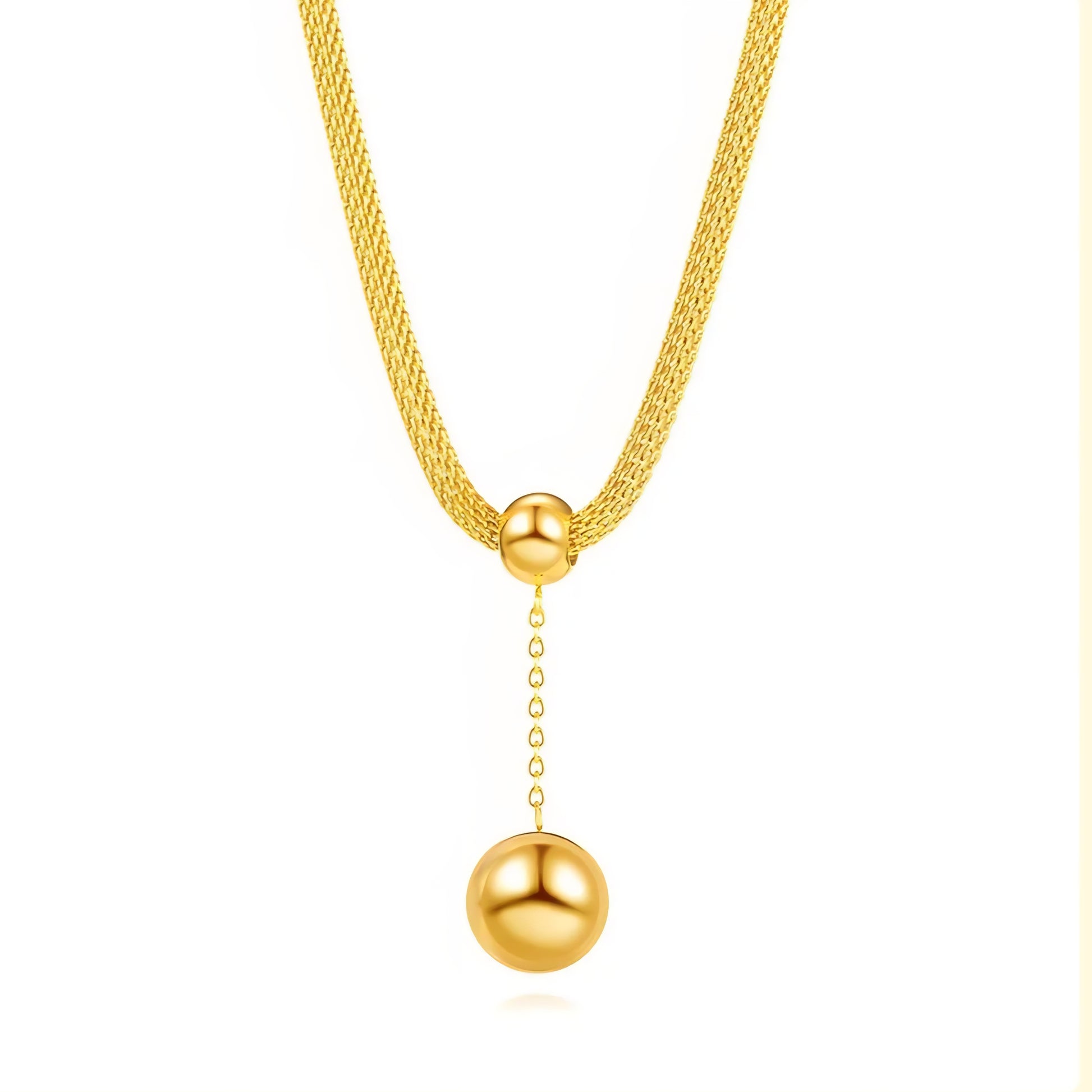 This elegant Double Ball Mesh Necklace is 18k PVD gold plated and crafted with stainless steel to prevent tarnishing.